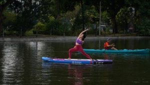Bayangkan melakukan gerakan yoga di atas papan, mengapung di atas air. Tenang, fokus, tapi tetap menantang keseimbangan.